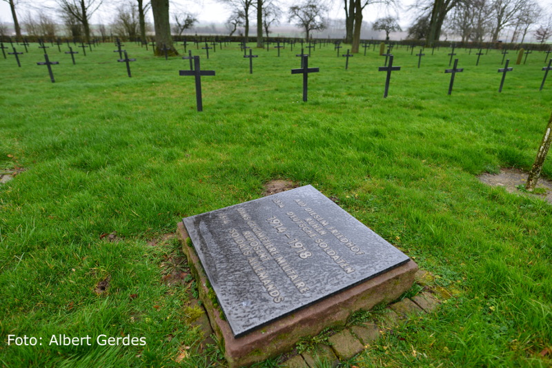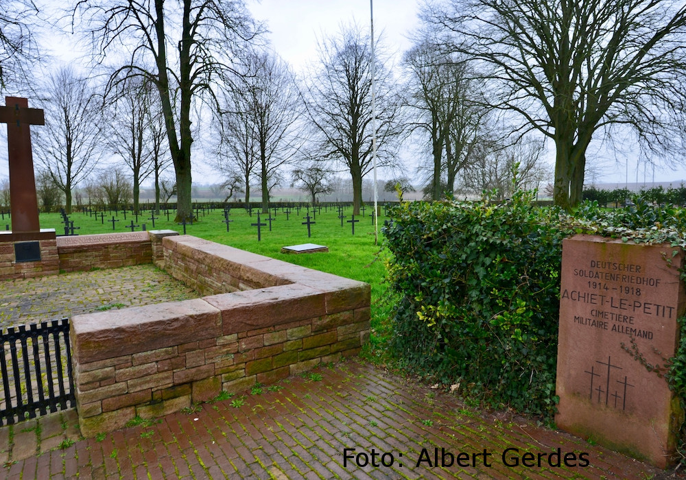 Der deutsche Soldatenfriedhof Achiet-le-Petit wurde im Herbst 1914 von der deutschen Militärverwaltung als Sammelfriedhof angelegt. Hierher erfolgte nachdem der Bewegungskrieg zum Stillstand gekommen war, die Zusammenbettung der im Gelände verstreuten, an der Stelle ihres Todes begrabenen Gefallenen aus den Kämpfen im Verlauf der ersten Kriegswochen. Weitere Bestattungen fanden in der Zeit bis zum März 1917 - zu dieser Zeit wurde das Gebiet von den Deutschen geräumt - und erneut von Ende März bis August 1918 statt, als das Gebiet um Achiet-le-Petit wieder in deutsche Hand gefallen war. Im Jahre 1924 haben die französischen Militärbehörden weitere (mehr als 300) deutsche Tote aus 12 umliegenden Gemeinden geborgen und hier wieder beigesetzt. Die überwiegende Zahl der Gefallenen wurde Opfer der "Schlacht an der Somme", die am 1. Juli 1916 vor den Toren von Albert begann und Ende November buchstäblich im Schlamm des Schlachtfeldes erstickte. In dieser Zeit hatten sich die Alliierten, unter furchtbaren Verlusten auf beiden Seiten, bei einer Angriffsbreite von 40 Kilometern im äußersten Fall nur bis zu 12 Kilometern vorwärts kämpfen können.