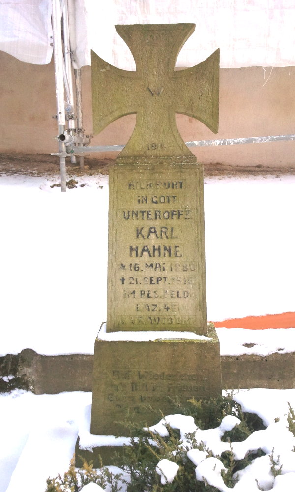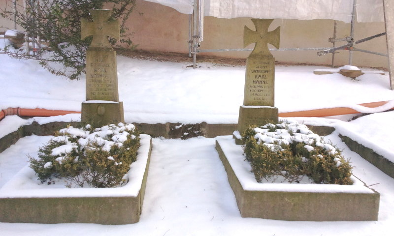 - am Kirchenaufgang 2 Einzelgräber deutscher Soldaten des Ersten Weltkrieges,