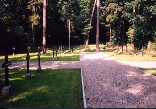 Die Anlage wurde mit Holz-Einzelkreuzen auf Betonfundamenten gestaltet; Kieswege erschließen die Anlage.