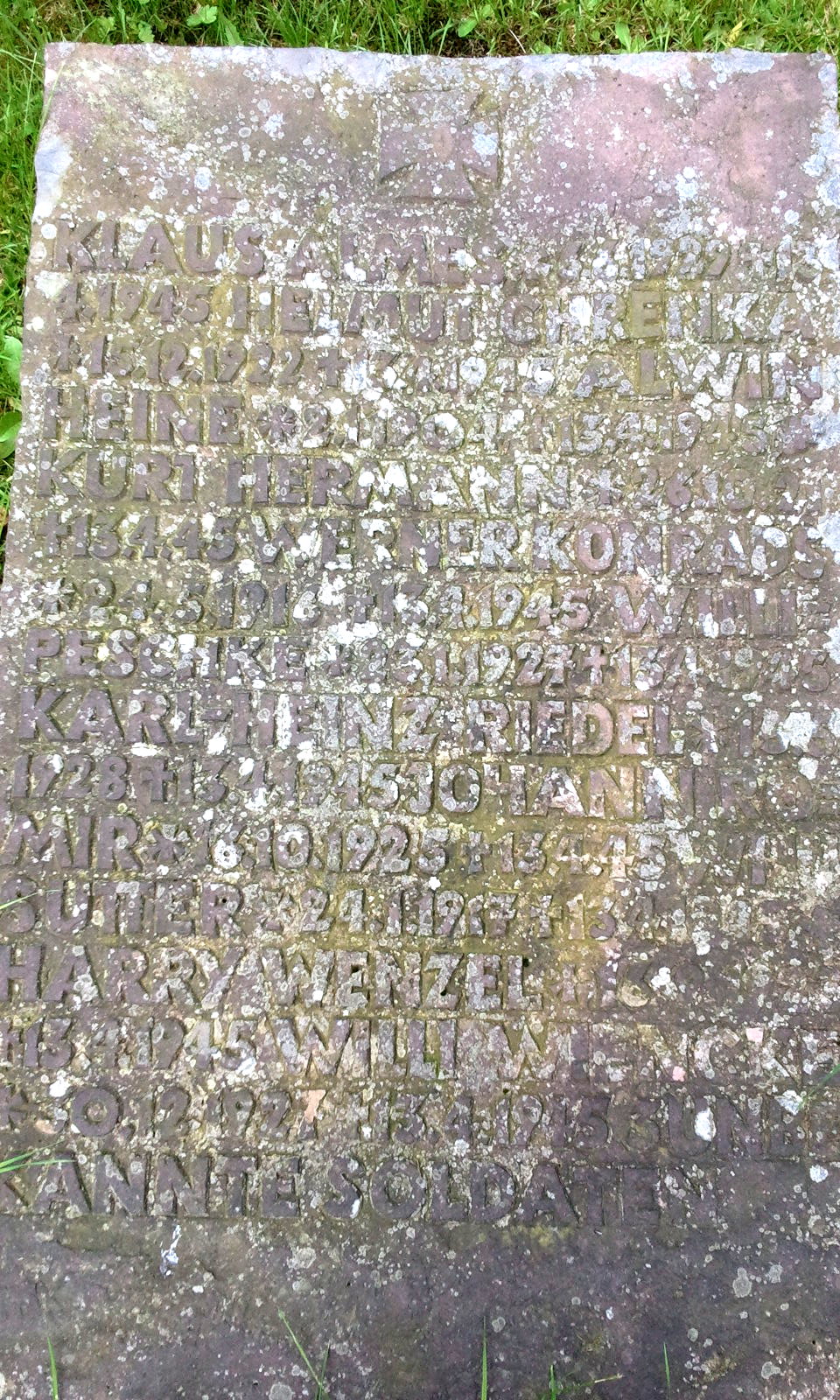 - 52 Soldaten verschiedener Truppengattungen von Heer, Luftwaffe, Waffen-SS und Volkssturm, von denen die meisten während der schweren Kämpfe im Oberharz zwischen Altenau und St. Andreasberg vom 12. - 14. April 1945 gefallen sind. Drei von ihnen blieben unbekannt.