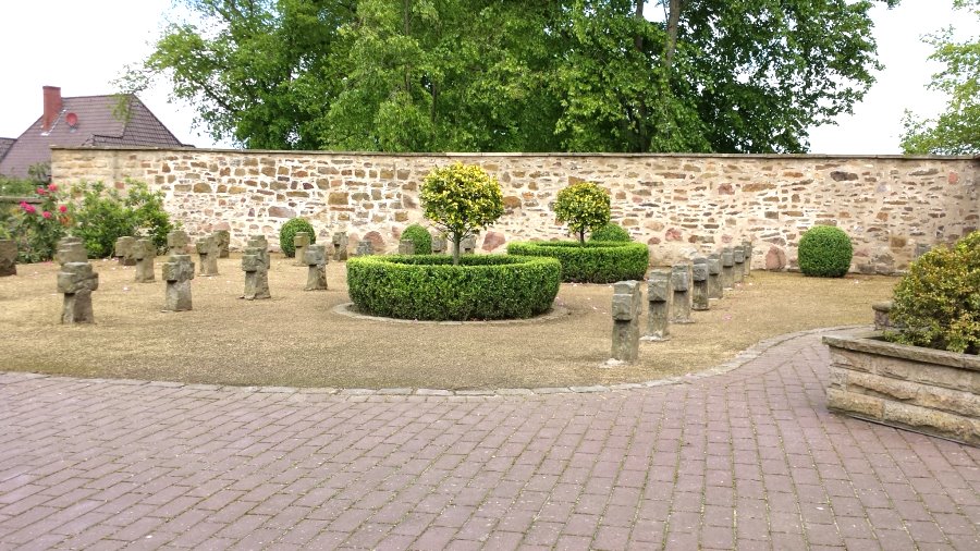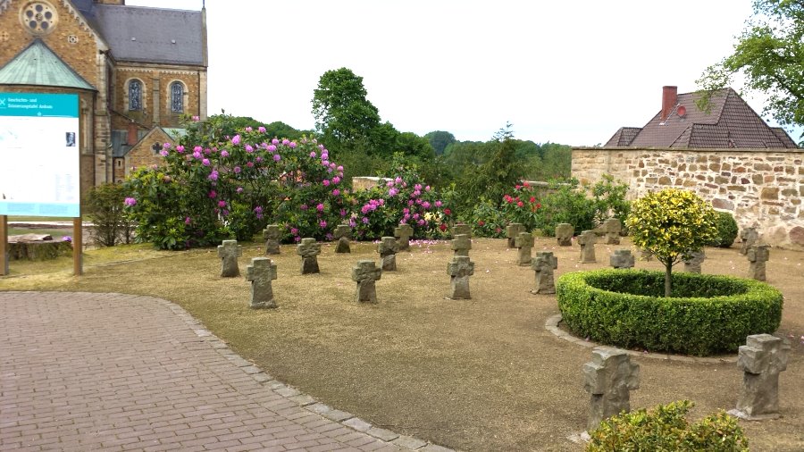 Auf dieser sehr gepflegten Kriegsgräberstätte am Domhof ruhen - nach den uns vorliegenden Informationen - insgesamt 29 Tote, Zivilisten und Soldaten, die am 7. April 1945 durch einen alliierten Luftangriff auf Ankum ihr Leben verloren.