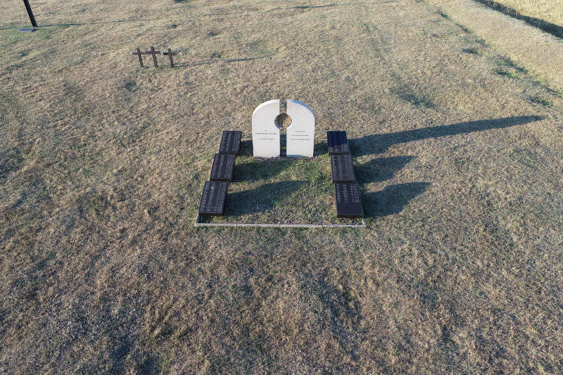 Die Gräber werden durch Symbolkreuzgruppen gekennzeichnet. Zentrales Mahnmal ist ein 4,5 m hohes Metallkreuz. Hier ist auch die Gedenkaussage: