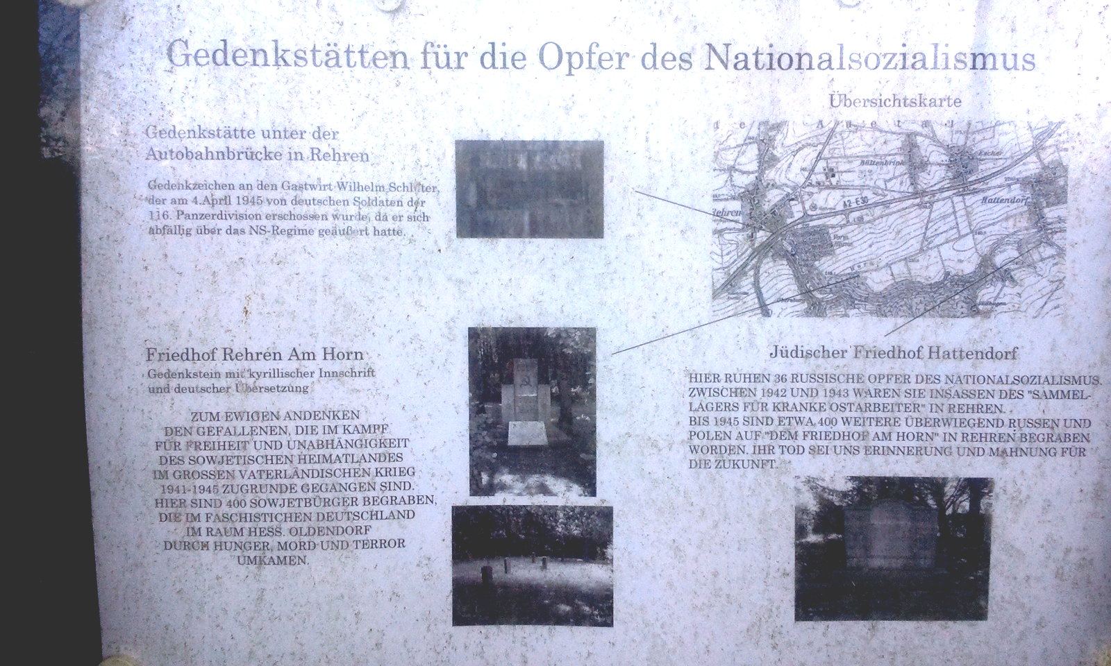 Auf dem kleinen jüdischen Friedhof an der Langenfelder Str. ruhen in einem Massengrab 36 sowjetische Staatsbürger, die in den Jahren 1942/43 in dem sog. "Sammellager für kranke Ostarbeiter" in Rehren ums Leben kamen (Siehe auch Schautafel - Bild 2).