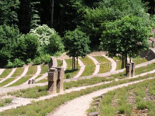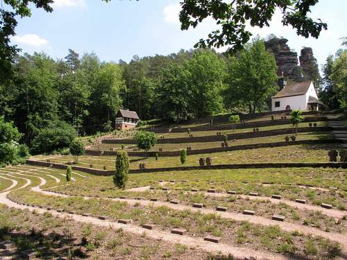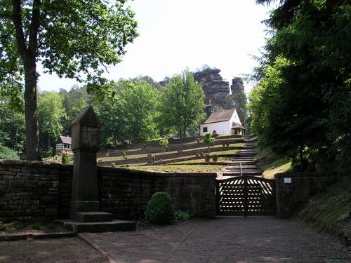 Auf dem Plateau über der Gräberanlage steht die St.-Michaels-Kapelle, die schon seit Jahrhunderten als ehrwürdige Wallfahrtsstätte besucht wird. Sie war einst mit besonderen Privilegien ausgestattet, sah Krieg, Mord und Brand, lag oftmals halb in Trümmern und wurde zeitweise von anderen Mächten in Besitz genommen. Wie durch ein Wunder entging sie im letzten Krieg der Zerstörung durch Brandbomben. Der Baukörper der Kapelle blieb in seinem Äußeren fast unverändert, zu seiner VervolIständigung wurde über dem Eingang ein Vordach angebracht. lm Inneren wurde der ursprüngliche Steinaltar wieder freigelegt. Unter dem Fenster mit dem Bild des hl. Michael, des Schutzpatrons der Krieger und Gefallenen, wurde der Steintisch zur Aufnahme der Kassette mit dem Ehrenbuch eingefügt.