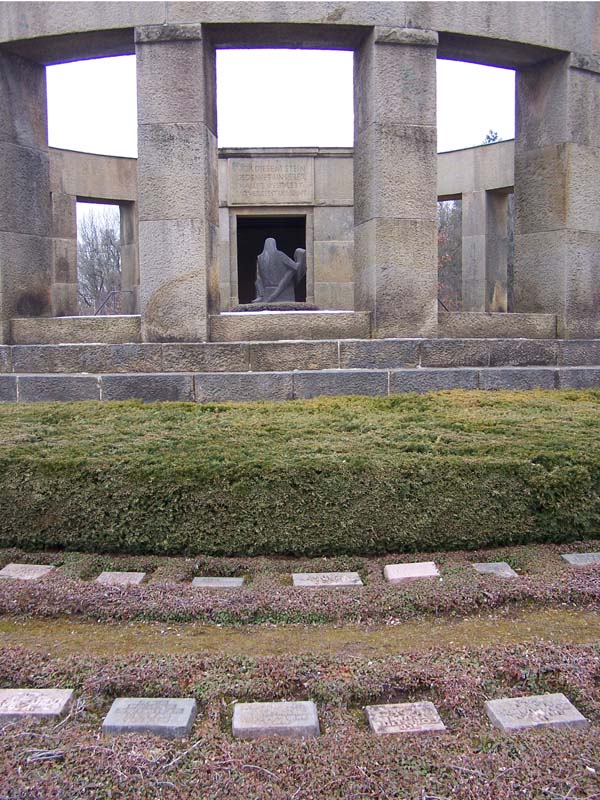 Der Friedhof ist als Rundgräberstätte angelegt und befindet sich auf der höchsten Erhebung des Geländes. Hier wurde das schon von weitem sichtbare Ehrenmal in der Form einer offenen Säulenhalle errichtet. In der Mitte des Ehrenmals befindet sich eine Pieta, die von Del Antonio Kunsmann aus Wittlich in der Eifel geschaffen wurde. Der Künstler zeigt die Trauer und das Leid der Mütter um ihre gefallenen Söhne am Beispiel der Muttergottes, die ihren toten Sohn in den Armen hält.