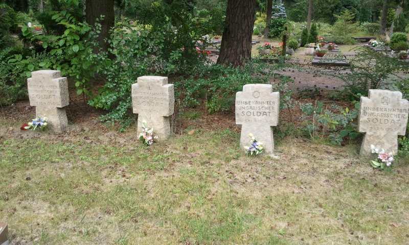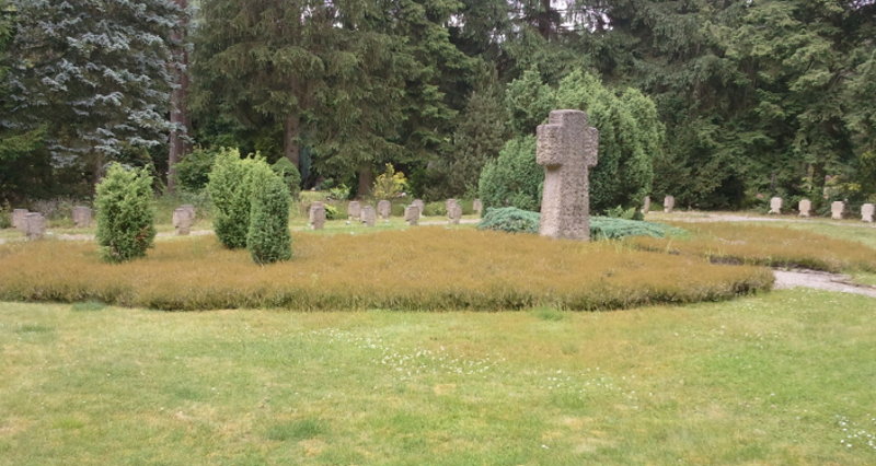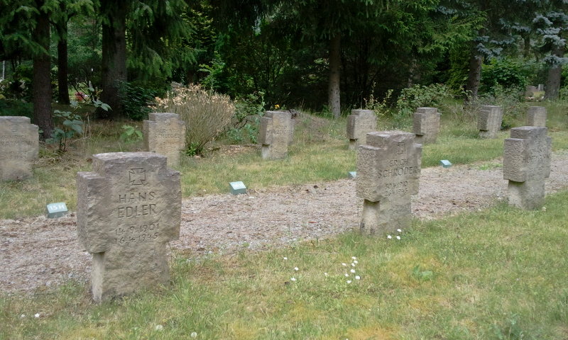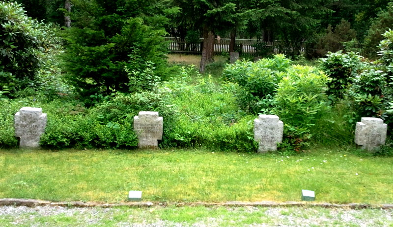 Auf der sehr gepflegten Kriegsgräberstätte im vorderen Teil des Waldfriedhofs ruhen - nach den uns vorliegenden Informationen - insgesamt 70 Tote des Zweiten Weltkrieges und der nationalsozialistischen Gewaltherrschaft.