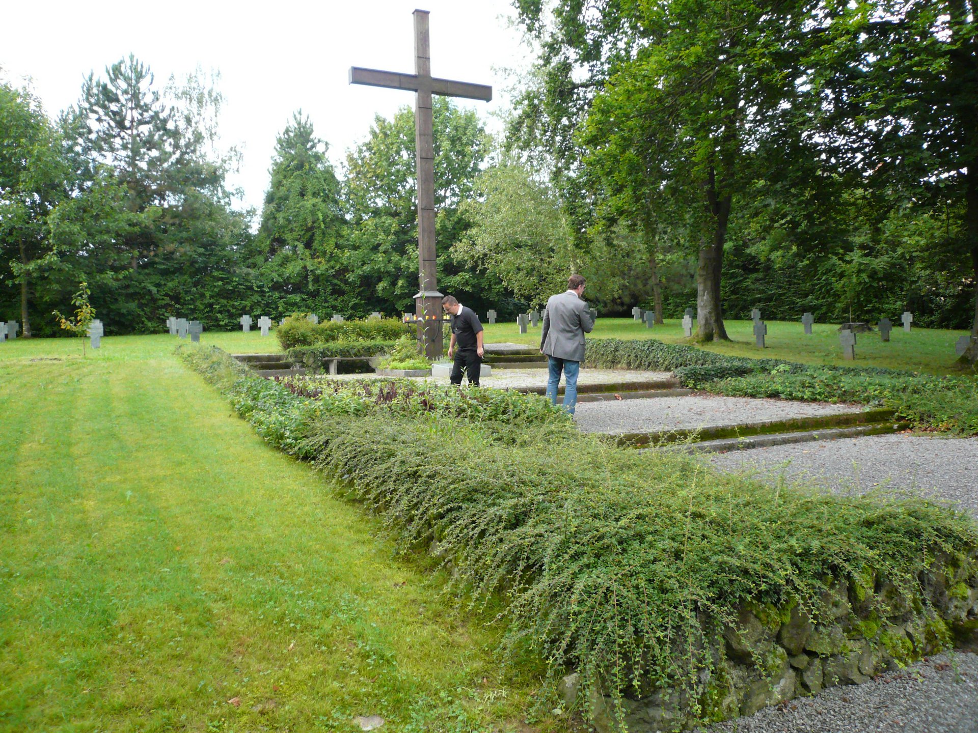 Inmitten der Anlage liegt ein kleiner Platz mit Hochkreuz und Aussagetafel.