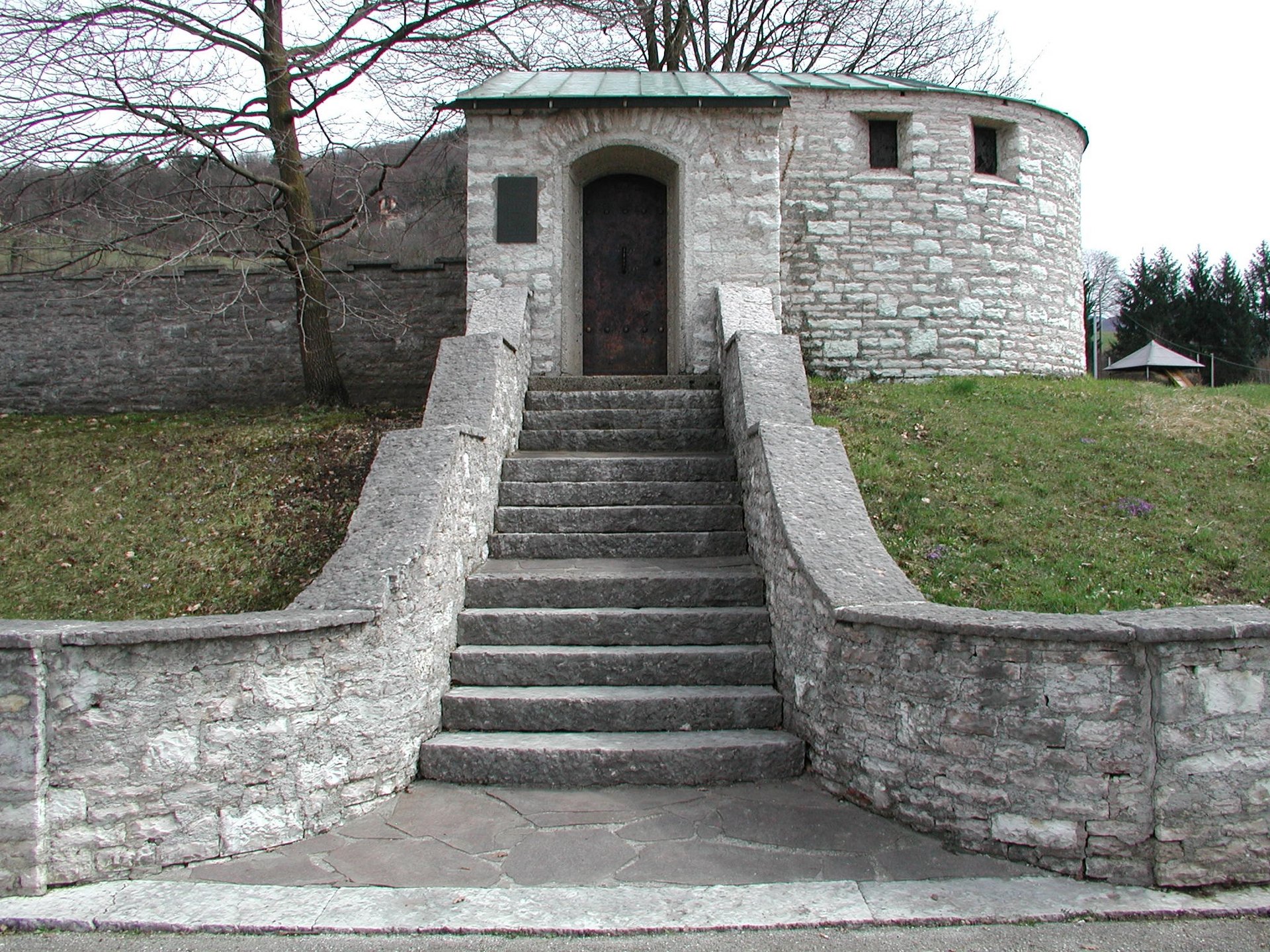 Ein weites Tal, gesäumt von bewaldeten Hängen; Maisfelder, Weinanbau, auf Hügeln gelegene Landhäuser und Bauernhöfe prägen die Landschaft. Das Eingangsgebäude aus Kalkstein liegt auf einer niedrigen Anhöhe. In einer angrenzenden steinernen Laube sind die Namen der hier Bestatteten verzeichnet. Kreuze aus rotbraunem Porphyr – ein vulkanisches Gestein – markieren die Grablagen auf der Rasenfläche.