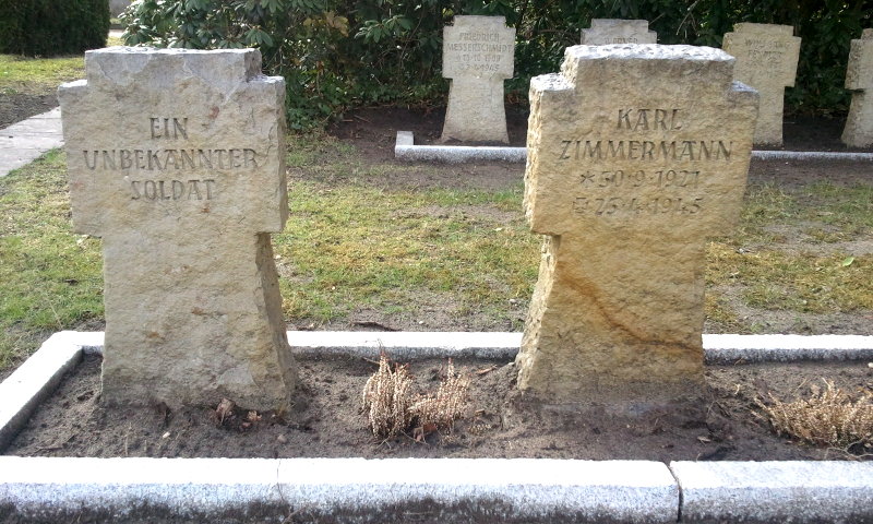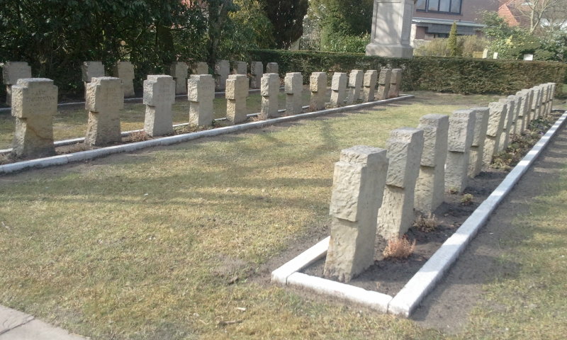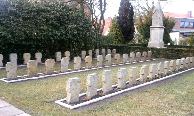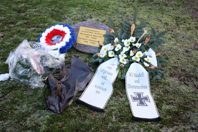 - links daneben, jetzt kenntlich durch einen kleinen Erinnerungsstein die Grabstätte von 2 britischen Fliegern. Ihr Wellington Bomber wurde bereits 1940 bei Ganderkesee abgeschossen und die bei der Bruchlandung Getöteten wurden danach anonym auf diesem Friedhof bestattet. Auch die britische Wargrave Commission wusste nichts von diesen Gräbern.