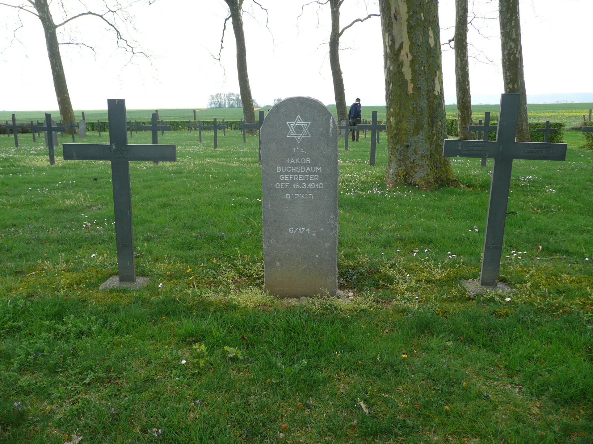 Die sieben Gräber der Gefallenen jüdischen Glaubens erhielten aus religiösen Gründen als Kennzeichen statt eines Kreuzes eine Grabstele aus Naturstein, deren hebräische Schriftzeichen besagen: