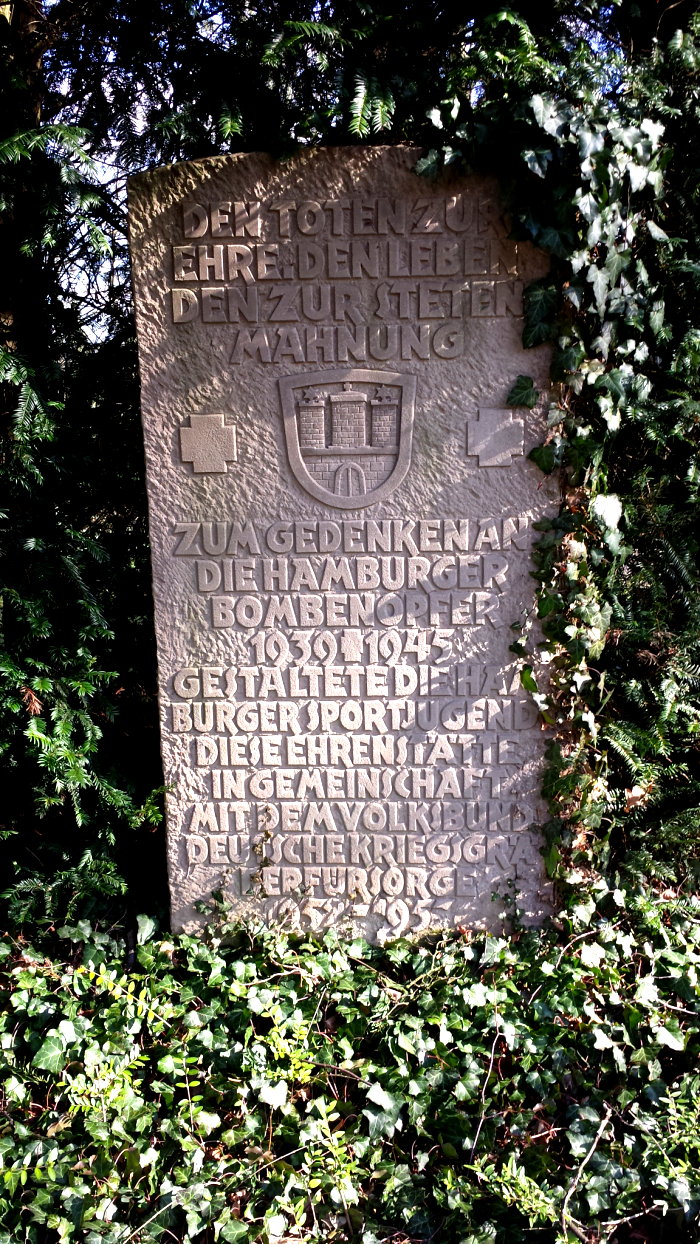 - in einer sehr großen, durch einen Mittelweg geteilten Grabanlage - neben dem Gräberfeld für die Soldaten - 309 deutsche zivile Opfer - Frauen, Männer und Kinder, die im sog. "Hamburger Krankenhaus", einem Ausweichkrankenhaus der Aktion Brandt an den Folgen der schweren Luftangriffe auf Hamburg und andere Städte im Zeitraum 1943 - 1947 oder nach ihrer Flucht aus den Ostgebieten verstorben sind. Hier ruhen auch auch die verstorbenen Zwangsarbeiterinnen und Zwangsarbeiter.