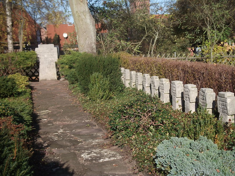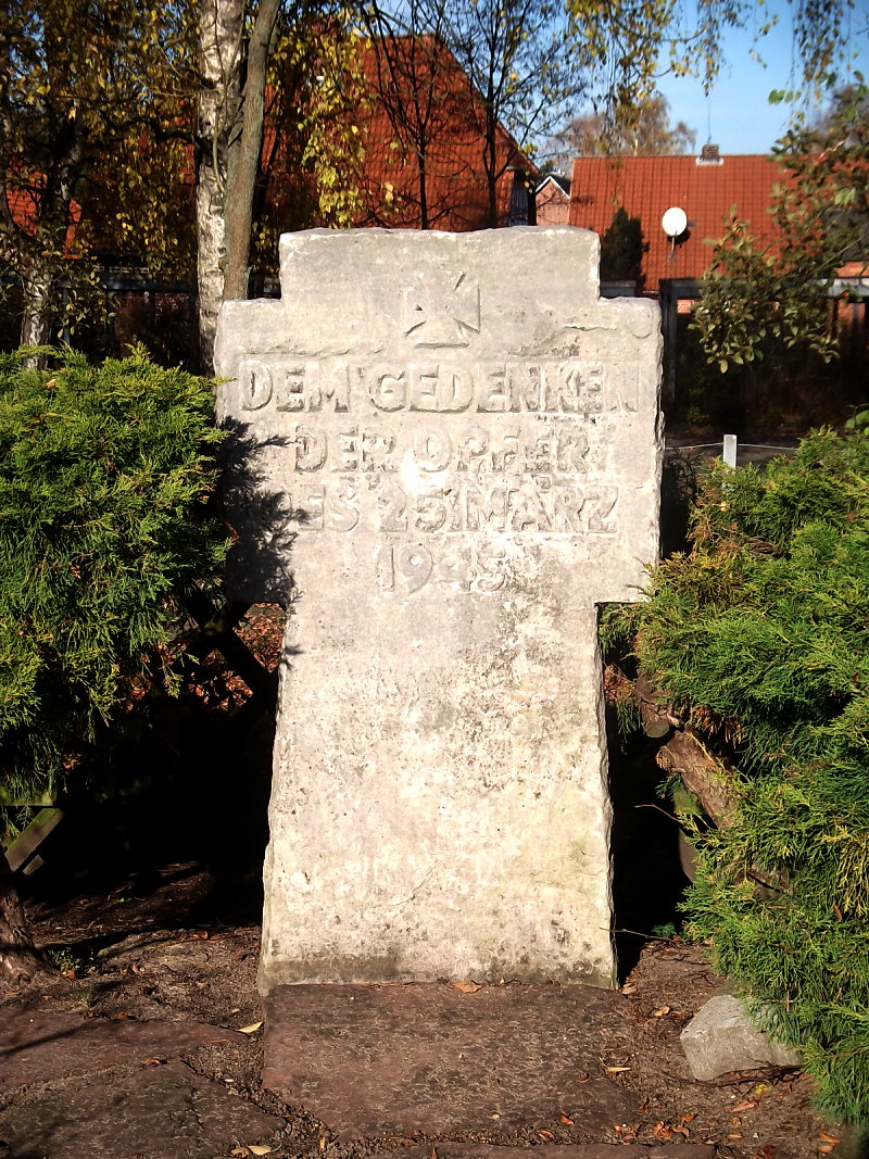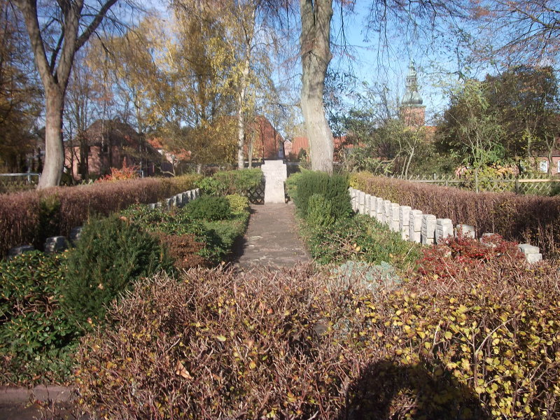 - Auf der rechten Friedhofsseite, umgeben von einer niedrigen Hecke, die Anlage für die 36 deutschen Opfer. Die meisten von ihnen starben bei der Explosion eines Munitionszuges auf dem Bahngelände Bodenteich am 25. März 1945, die nach Darstellung in der Ortschronik etwa 80 Todesopfer gefordert und große Schäden angerichtet hat.