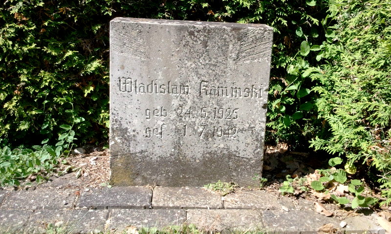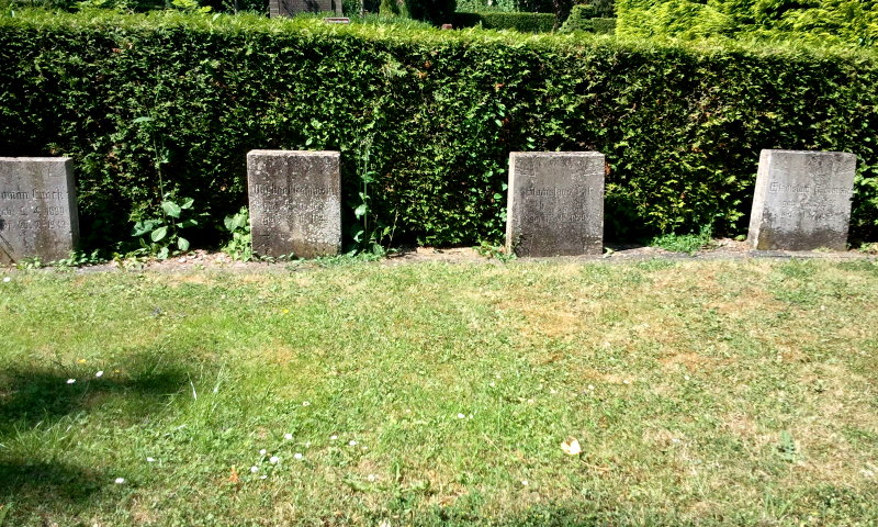 - Etwas unterhalb an einer Hecke befinden sich 4 Einzelgräber von polnischen Zwangsarbeitern. Ihre Namen Ihre Namen und Daten sind auf kleinen Grabstelen verzeichnet. Sie starben bereits 1942.