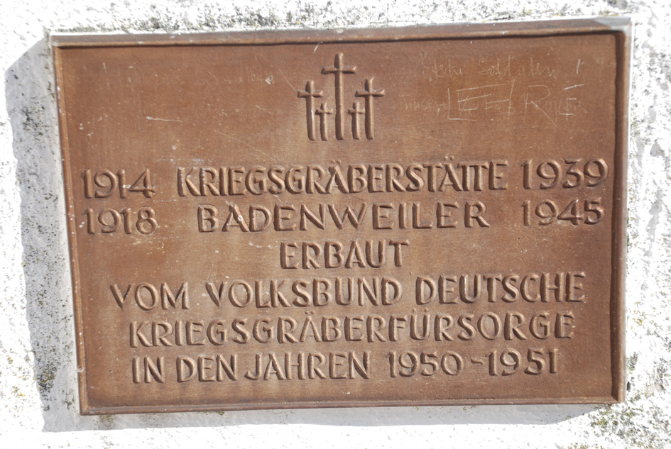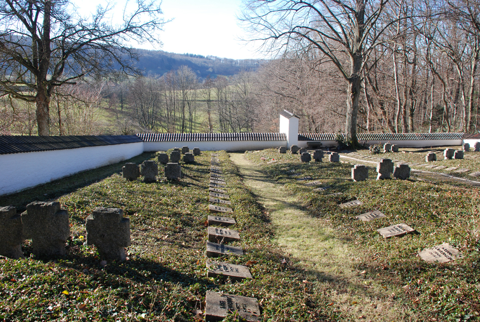 Auf dem 1950 gestalteten Friedhof liegen 326 Kriegstote. Es handelt sich hauptsächlich um im Lazarett Verstorbene, aber auch um Tote aus den Kämpfen um MüIlheim (Bd.). Eine niedrige Mauer umschließt die Anlage. Namensteine kennzeichnen die Gräber. Granitkreuze sind in Dreiergruppen über das Gräberfeld verteilt. In der Kapelle wurden die Namen der Gefallenen in Sgraffito festgehalten.