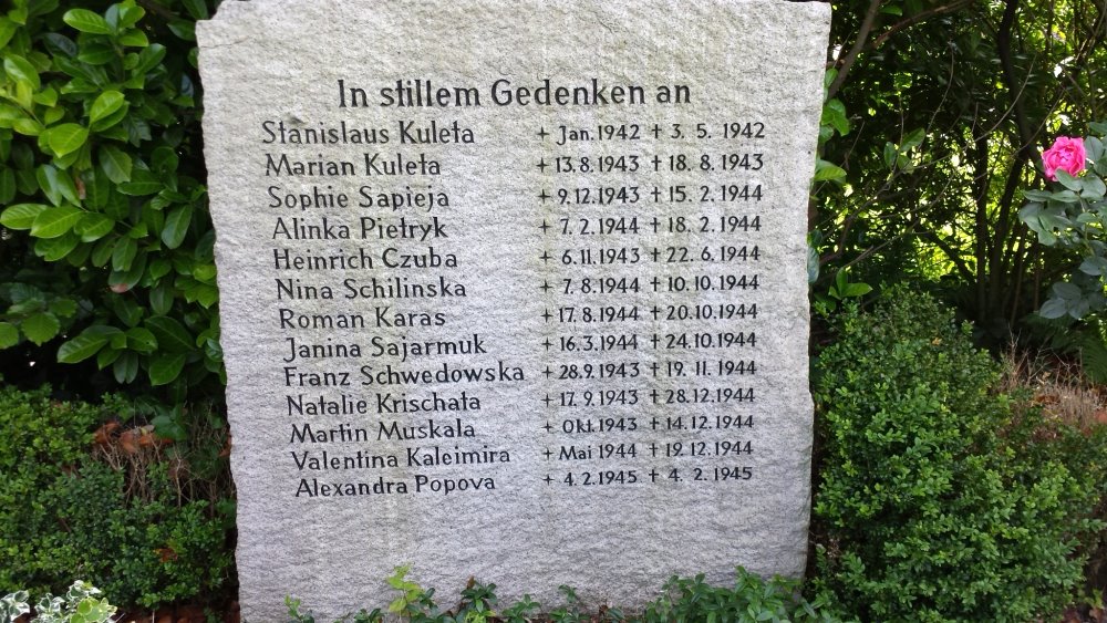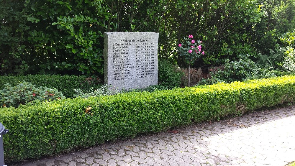Auf diesem Friedhof ruhen in einer sehr gepflegten kleinen Gräberstätte im hinteren linken Teil des Friedhofs - nach den uns vorliegenden Informationen - insgesamt 16 Tote des Zweiten Weltkrieges und der nationalsozialistischen Gewaltherrschaft.