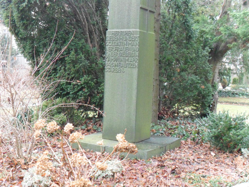 Auf dem Friedhof erinnert ein Stein-Obelisk an die Gefallenen der französischen und der verbündeten russisch-preußischen Armeen der Befreiungskriege von 1813.